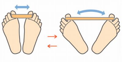 引っかけ、かかとをくっつけてつま先を扇形に広げ、親指同士が引っ張りあう感じの運動