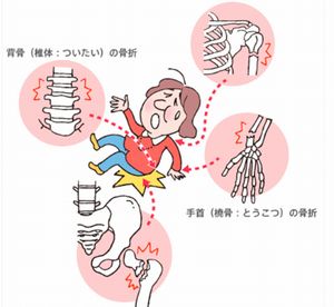 てしまうことになります。骨折しやすい場所は、背骨、太ももの付け根、腕の付け根、手