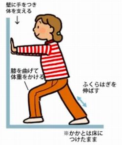 ます。次に、両手を壁につけて背筋を伸ばしたまま壁に体を倒しますが、このとき右足の