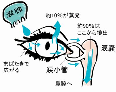 てあふれ出る(分泌性流涙)ことになったり、涙の通り道(涙道)が狭くなったり、加齢