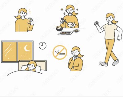 バランスのとれた食事、飲酒・カフェインの摂取を控える、タバコをやめる、適度な運動