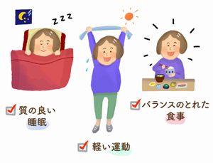 基本的には、規則正しい生活、ストレスの解消、十分な睡眠、適度な運動ということで、