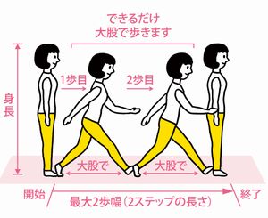 2ステップテストは、両足のつま先を合わせて立ち、できる限り大股で2歩歩き両足を揃
