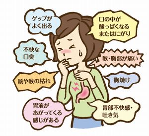 逆流性食道炎の症状は、食後の胸焼け、喉に酸っぱいものや苦いものがこみ上げてくる感