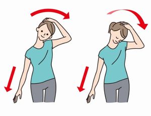 首にこりを感じているときは、左手を側頭部に当て、右手は床に向かって引き下げ10秒