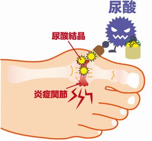 の量が増えて、どこかの関節が赤く腫れて痛い(関節の中に尿酸の結晶がある)という症
