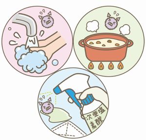 まな板や包丁などの調理器具も、洗浄後に次亜塩素酸ナトリウムなどで消毒すると効果的