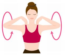 次に、肩に手を乗せて、肘を大きく前に5回、うしろに5回まわします。ついでに座った