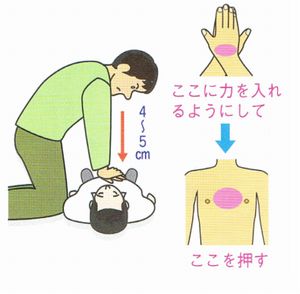 両側の乳頭を結んだ高さで、胸の真ん中の胸骨を5cmほどへこむように、体重をかけて、