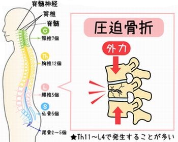 の腰椎の椎体が圧力によって潰れた状態が腰椎圧迫骨折ということです。よく知られてい