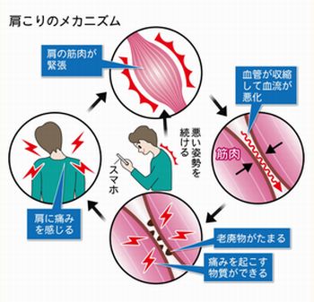 て、結果、肩周辺の血流が悪くなって肩こりが生じることになります。