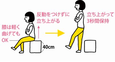 は少し違いますが、椅子に腰掛けて、片脚または両脚だけで椅子から立ち上がれるかどう