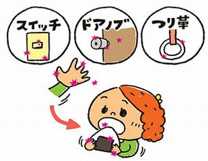 次に、電車のつり革や手すりなど、くしゃみをした人が手で口を押さえた際、病原菌がつ